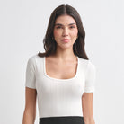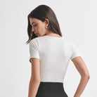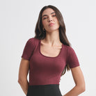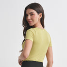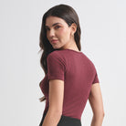 Camiseta sin costuras, con manga corta, cuello redondo y textura.